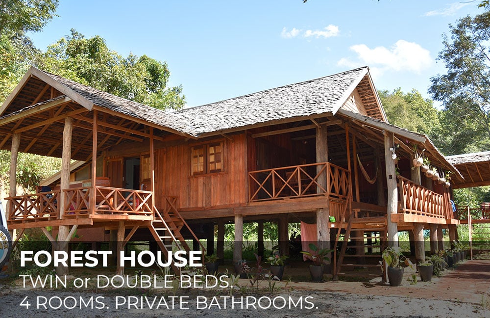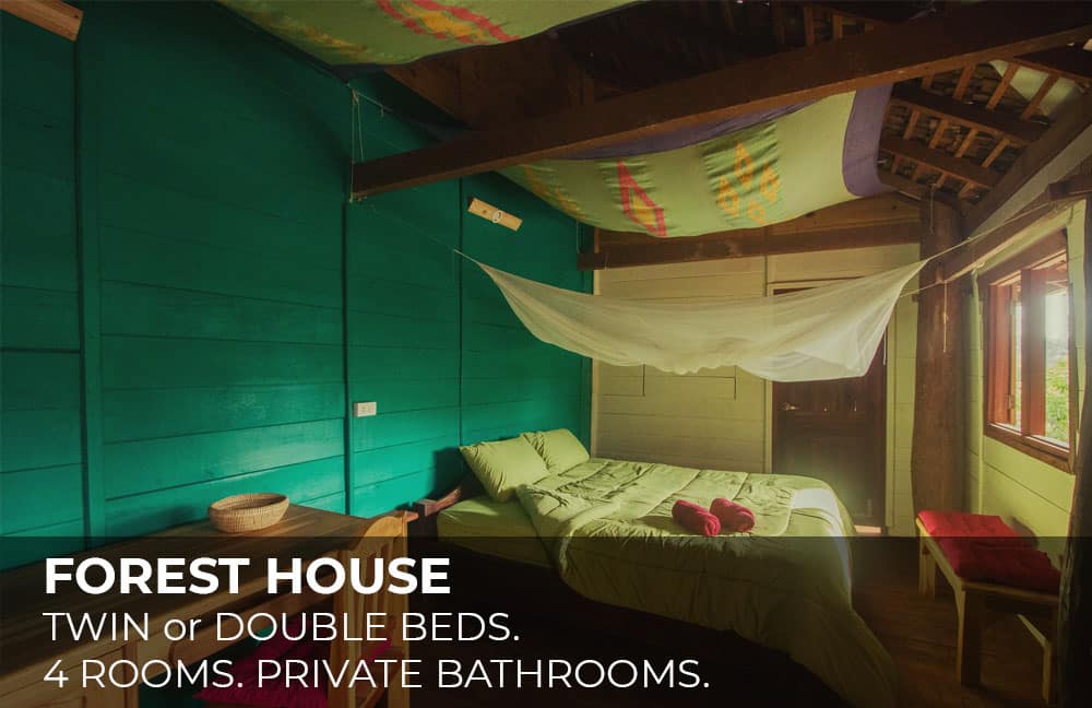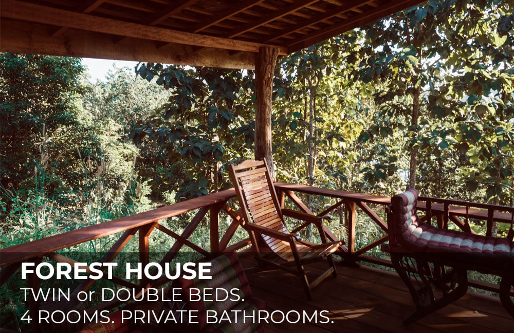 Tucked away amidst lush rainforest greenery, the house has 4 rooms to choose from. Two rooms feature a double bed and single bed, and the other two have one double bed. Enjoy a private balcony overlooking the landscape — ideal for families or groups seeking their own space
