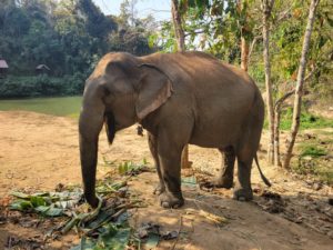 Mae Boua Phan profite d’un déjeuner au soleil au Centre de Conservation des Éléphants.