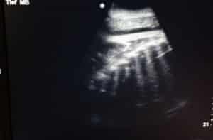La Dr. Anabel Lopez Perez et le Dr Christopher Stremme examinent l’échographie de Mae Boua Phan. Les côtes du bébé sont visibles sur l’image en noir et blanc.