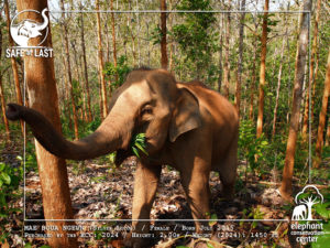 Dor Khoun Mueang, en train de devenir un jeune homme. Il devient progressivement indépendant, s’aventurant souvent seul tout en maintenant des liens étroits avec ses tantes. Le déploiement du collier GPS constitue un outil essentiel pour assurer sa sécurité et le bien-être des communautés humaines voisines pendant cette phase exploratoire de sa vie. L’objectif à long terme est que Dor Khoun Mueang établisse son propre territoire et noue des liens sociaux avec des femelles sauvages en vue d’un éventuel accouplement.
